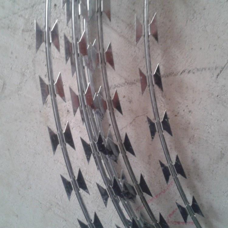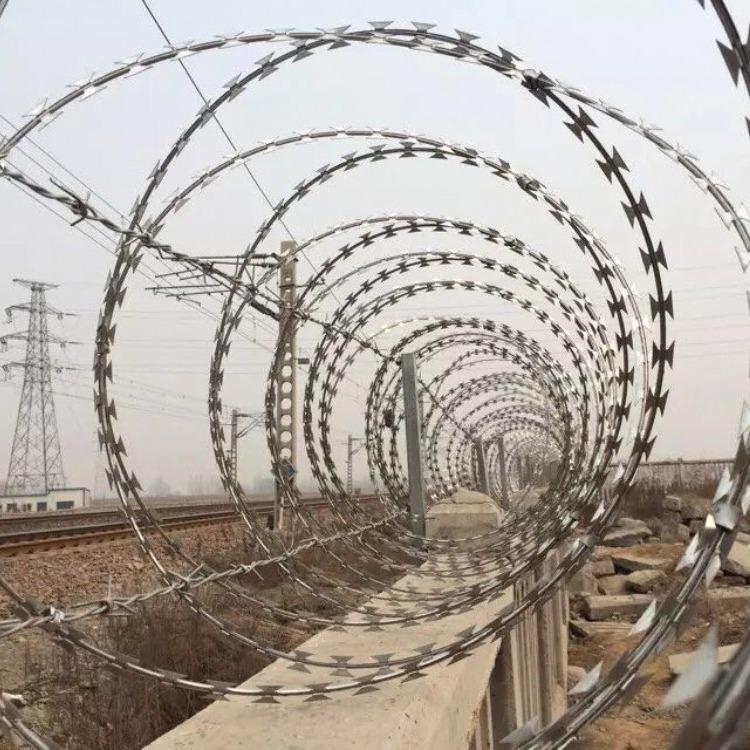 2012年最新《鐵路線路防護(hù)柵欄》[通線(2012)8001]通用參考圖出爐! 文獻(xiàn)規(guī)定:鐵路柵欄一改往日焊接鋼絲網(wǎng)柵欄、刺絲網(wǎng)柵欄等產(chǎn)品,改為防御性更強、壽命更長久的:鋼筋混凝土柵欄+0.5米高刺絲滾籠的防護(hù)柵欄。詳細(xì)內(nèi)容如下: 鋼筋混凝土柵欄:詳見圖紙 0.5米高刺絲滾籠組成:刺絲刺繩+刀刺滾籠+鋼絲+立柱 圖集中:5、刺絲滾籠:(1)刺絲滾籠采用刀片刺繩繞圈后相鄰兩圈每隔120度用刺絲連接卡固定,張開后形成蛇腹網(wǎng)狀,閉合后刀片刺繩卷徑為50cm,張開后每交叉圈安裝間距20cm,直徑不小于45cm。(2)刀片刺繩由沖切鋼板采用機械軋在鋼絲上成型,刀刺寬度22mm,刀刃垂直間距15mm,刀刺縱向間距34mm,芯絲直徑為2.5mm。刀片厚度0.5mm的Q195鋼板網(wǎng)沖切制作。芯絲由HPB300 -6.5mm高線鋼絲冷拔加工。(3)刺絲滾籠由刺絲連接卡扣與固定在支架上的縱向拉筋相連接??v向拉筋與支架的連接采用-2.5mm的冷拔鍍鋅鋼絲繞2圈后擰緊固定。