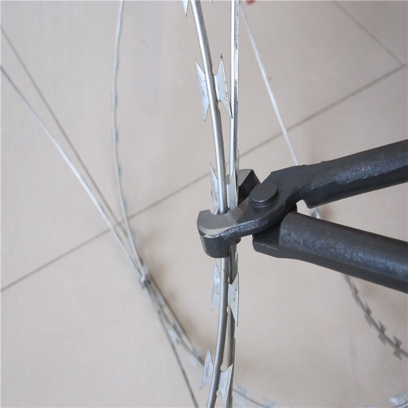 工程案例刀片刺繩護欄網(wǎng)是一種近年發(fā)展起來的防護、隔離能力較強的新型防護網(wǎng)產(chǎn)品。它采用鋼板沖壓成型包附于熱鍍鋅鋼絲(筋絲)之上,由銳利尖角鍍鋅鋼板或不銹鋼薄板做刀片,高張力鋼絲做芯線組合而成的。鋒利的刀型刺由雙線扣裝后成蛇腹狀,既美觀又讓人不寒而栗。起到了很好的阻嚇作用。