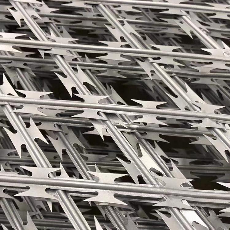 拘留所防攀爬隔離網(wǎng)常見的兩種樣式,鋼絲網(wǎng)片與焊接刀片。這兩種只是網(wǎng)片上邊的材料不同,立柱邊框都是可以通用的。