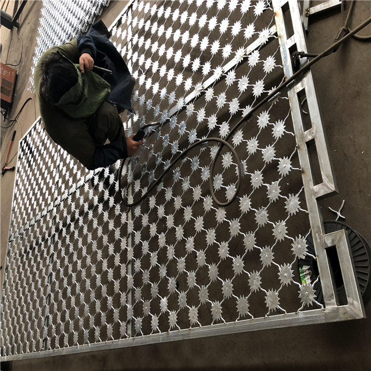 工程案例監(jiān)獄梅花刺片隔離網(wǎng)一改往常鋼網(wǎng)墻長方形的網(wǎng)孔形式,采用菱形孔的美格網(wǎng)網(wǎng)片,在網(wǎng)片的每個截點焊接梅花形刺片,因其特珠的外形,相較于之前的普通鋼網(wǎng)墻,無法采取腳踩、手握的方式翻越,防攀吧性能、安全性能有所增加。表面處理多采取熱鍍鋅的形式,也有要求較高的地方采用不銹鋼材質(zhì)的鋼網(wǎng)墻,防腐蝕效果更佳。故而已被越來越多的監(jiān)獄、看守所、邊防線等單位使用。