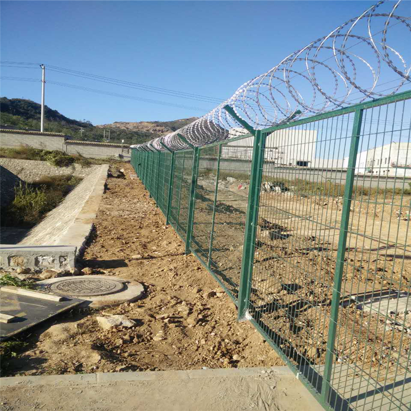 垃圾場區(qū)圍欄網(wǎng)采用焊接網(wǎng)隔離柵生產(chǎn)制造,焊接網(wǎng)隔離柵是由立柱連接網(wǎng)片組成。焊接網(wǎng)隔離柵采用2.5mm冷拉絲后焊接而成,每個網(wǎng)孔的橫絲有一個弧度,已增加強(qiáng)度,網(wǎng)片和立柱采用不銹鋼卡子現(xiàn)場連接,立柱采用焊接鋼管制作,加蓋柱帽。