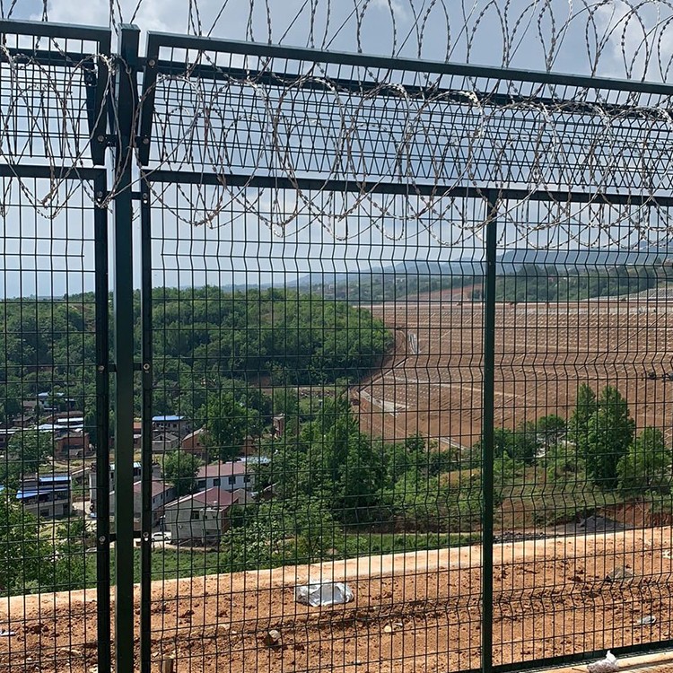 標(biāo)準(zhǔn)的機(jī)場(chǎng)圍界采用直徑5.0mm優(yōu)質(zhì)低碳鋼絲焊接,網(wǎng)孔50mm*100mm,50*200mm,也可根據(jù)要求定做。所用的立柱為60X60的矩形鋼或圓管立柱,頂端焊有V型支架,也可采用70mmX100mm的掛式連接立柱。產(chǎn)品均為熱鍍鋅后采用高質(zhì)量的聚酯粉末靜電噴涂,采用國(guó)際流行的RAL顏色。連接方式主要使用M卡,抱卡連接,表面處理常用熱鍍、噴塑、浸塑,常見顏色為綠色。具有美觀、實(shí)用、方便運(yùn)輸和安裝的特點(diǎn),安裝時(shí)還能適應(yīng)地形,與立柱連接位隨地面起伏可上下調(diào)整。頂部加裝刀片刺絲、刀片刺網(wǎng)后又很好的增強(qiáng)了安全防護(hù)性能。產(chǎn)品造型美觀、花色多樣,既起到圍欄作用,又起到美化作用。由于具有安全性高、防攀爬能力好,網(wǎng)片連接方式采用特制SBS緊扣件,有效防止人為的破壞性拆卸,橫向2-4道折彎加強(qiáng)筋,使網(wǎng)面強(qiáng)度增加,每6米增加一根斜撐,這樣防風(fēng)性能也加強(qiáng)了。
