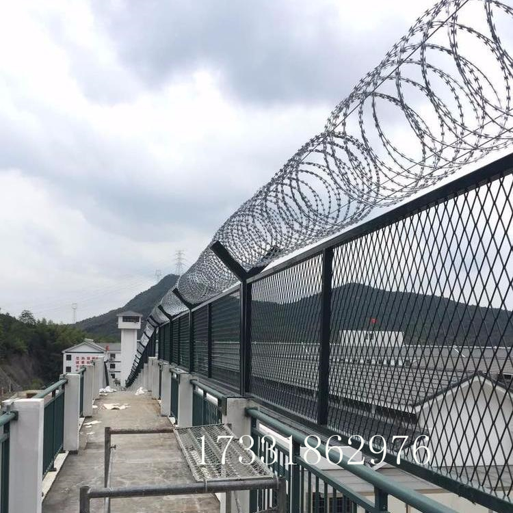 此種刀片刺網一看就令人不寒而栗,在陽光下亮閃閃的泛光,而且因為是金屬的材質,還可以安裝傳感裝置,因而是安全性能極佳的一種安全防護網。這種刀片刺網網身剛硬,不必用張力絲和高技術工人維護,簡易安裝而且維護成本低。因而在軍事重地,監(jiān)獄,政府機構,銀行,小區(qū)圍墻,別墅圍墻高速路,和邊境線上這些安全性要求高的地方安裝。