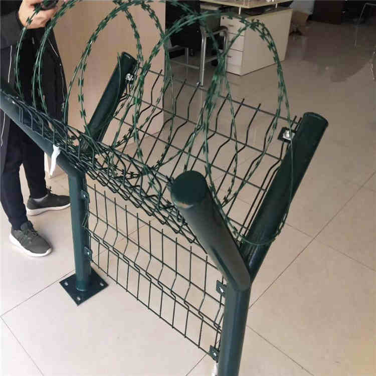 監(jiān)獄防護網(wǎng)又稱監(jiān)獄護欄網(wǎng)或監(jiān)獄隔離柵,主要是采用高強度的刀片刺網(wǎng)與普通防護網(wǎng)的結合,由V型支架立拄,加強型焊接片網(wǎng),安全防盜連接件和刀片刺網(wǎng)組成.刀片刺網(wǎng)是一種新型防護網(wǎng),由銳利尖角鍍鋅鋼板或不銹鋼薄板做刀片,鋼絲做芯線組合而成的防護器材.