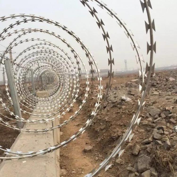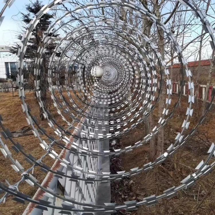 它可以在墻面直接安裝,也可以在柵欄上安裝,主要起到防護(hù)防盜防攀爬的作用,形狀像是一條盤踞的大蛇,每圈的刀刺間距是4mm,刀刺長22mm,刀刺特別鋒利,只要觸摸都會被刺傷,是現(xiàn)在小區(qū)、單位、學(xué)校、水庫、園林、監(jiān)獄、家用等需要隔離防護(hù)場所必備的一款鋼絲網(wǎng)。