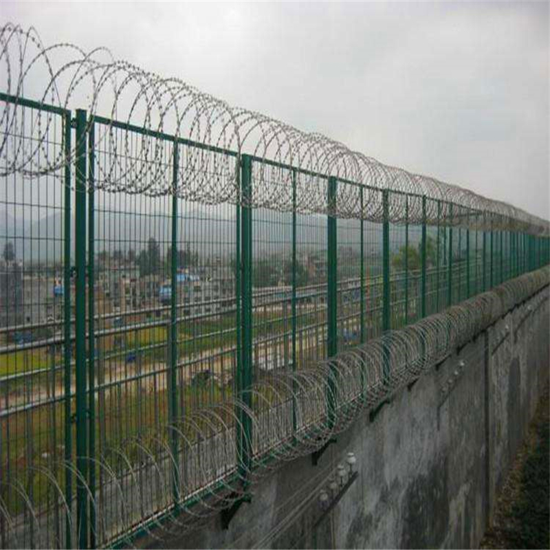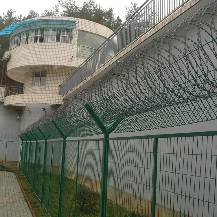 監(jiān)獄防護網(wǎng)又稱監(jiān)獄護欄網(wǎng)或監(jiān)獄隔離柵,主要是采用高強度的刀片刺網(wǎng)與普通防護網(wǎng)的結(jié)合,由V型支架立拄,加強型焊接片網(wǎng),安全防盜連接件和刀片刺網(wǎng)組成.刀片刺網(wǎng)是一種新型防護網(wǎng),由銳利尖角鍍鋅鋼板或不銹鋼薄板做刀片,鋼絲做芯線組合而成的防護器材. 監(jiān)獄防護網(wǎng)刀片刺網(wǎng)具有嚇阻、防翻越等效果,材質(zhì)堅硬,高強度,高張力,造型設(shè)計獨特,不宜觸摸,因而能達到極好的防護隔離效果.監(jiān)獄護欄網(wǎng)還具有施工簡便,經(jīng)濟實用等優(yōu)點. 材質(zhì):監(jiān)獄防護網(wǎng)選用低碳鋼絲、鋁鎂合金絲編織及特點:編制焊接而成。