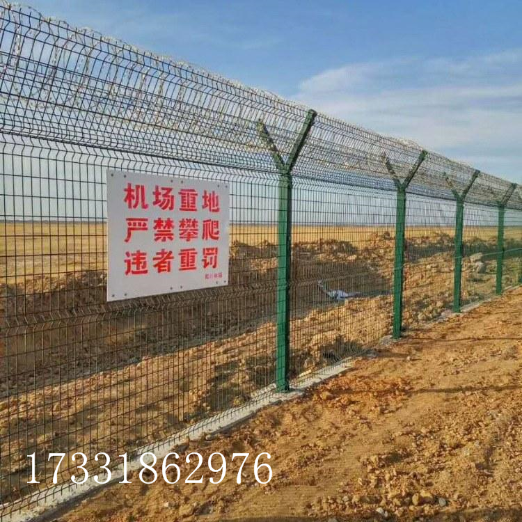 機場圍界又稱作“Y型安全防御護網”,是由V型支架立柱加強型焊接片網,安全防盜連接件和熱鍍鋅刀片刺網組成強度和安全防御性級別很高。飛機場護欄網頂部加裝刀片刺絲、刀片刺網后又加強了安全防護性能。表面采用電鍍、 熱鍍、噴塑、浸塑等防腐形式,具有良好的抗腐蝕、抗曬、抗老化的優(yōu)點。其造型美觀、花色多樣,既有安全作用又有美觀作用。被廣泛應用在機場,監(jiān)獄,軍事基地等高安全場所。