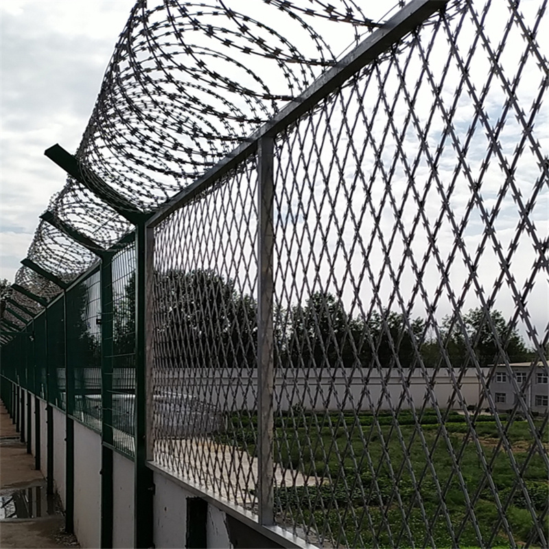 網(wǎng)片與立柱頂端上懸掛刀片刺繩,材料采用鋼板沖壓成型包附于鋼絲(筋絲)之上,由銳利尖角鍍鋅鋼板或不銹鋼薄板做刀片,高張力鋼絲做芯線組合而成的。鋒利的刀型刺由雙線扣裝后成蛇腹狀,既美觀又讓人不寒而粟。起到了很好的阻嚇作用。
