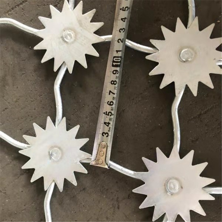 1、太陽花刺片監(jiān)獄鋼網(wǎng)墻為單層梅花刺片網(wǎng),直徑不小于7.5cm,刺片厚1.5mm,采用Q235低碳鋼板沖壓成型。