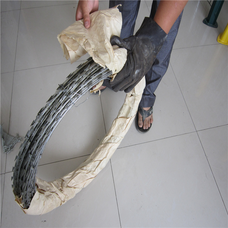 (1)刺絲滾籠采用刀片刺繩繞圈后相鄰兩圈每隔120度用刺絲連接卡固定,張開后形成蛇腹網(wǎng)狀,閉合后刀片刺繩卷徑為50cm,張開后每交叉圈安裝間距20cm,直徑不小于45cm。