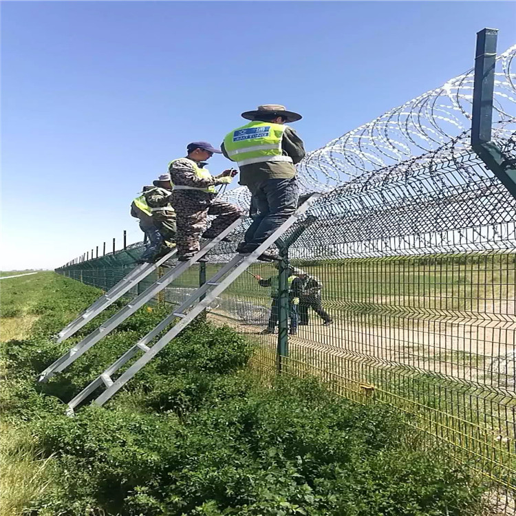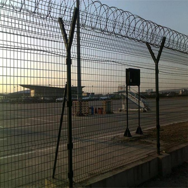 6、特點:如果在機場護欄網(wǎng)頂部加裝刀片刺絲、刀片刺繩后又很好的增強了安全防護性能。采用電鍍、熱鍍、噴塑、浸塑等防腐形式。其產(chǎn)品造型美觀、花色多樣,既起到圍欄作用,又起到美化作用。由于具有安全性高、防攀爬能力好,網(wǎng)片連接方式采用特制SBS緊扣件,有效防止人為的破壞性拆卸,機場護欄網(wǎng)橫向四道折彎加強筋,使網(wǎng)面強度顯著增加。
