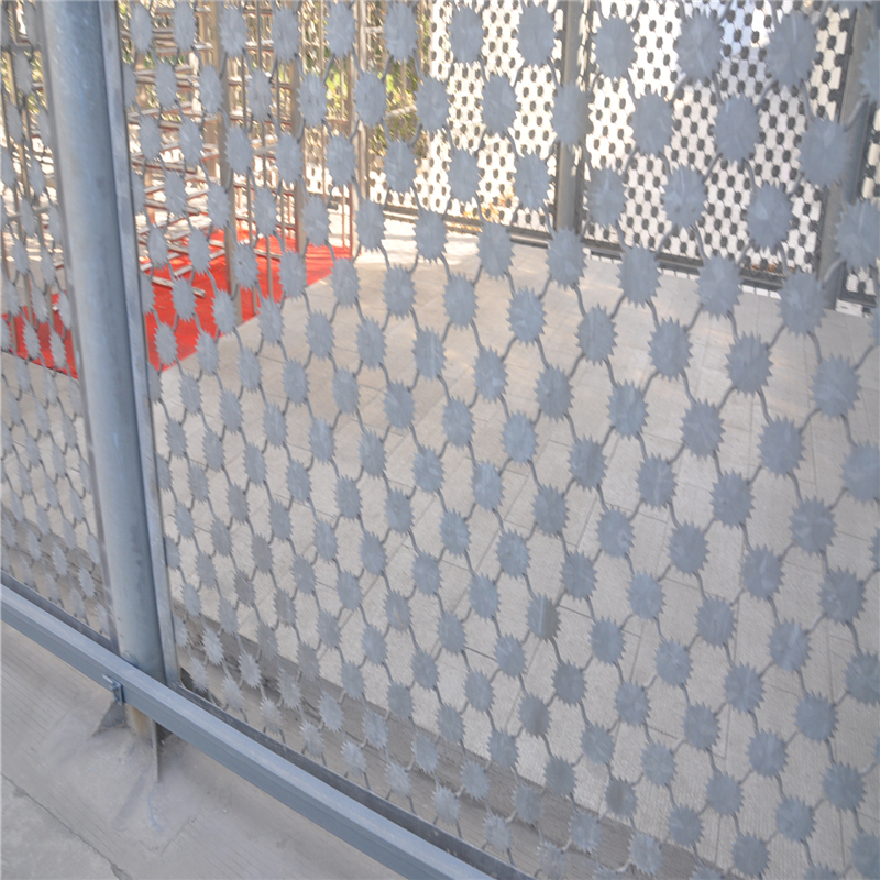 1、梅花刺防攀爬隔離網(wǎng)為單層梅花刺片網(wǎng),直徑不小于7.5cm,刺片厚1.5mm,采用Q235低碳鋼板沖壓成型。