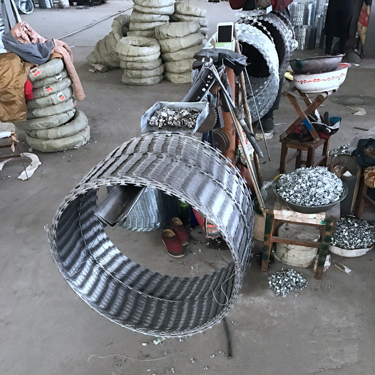 Y型架上邊架蛇腹型刀刺網(wǎng):由熱鍍鋅鋼板或不銹鋼薄板沖壓出尖利的刀片狀,高張力鍍鋅鋼絲或者不銹鋼絲做芯線組合而成的阻盡器材。刀刺直徑采取50或60厘米,刀型整潔、刀片鋒利排列均勻致密、連接堅固、防腐才能強,可能達到防擎越、防拆卸更高保險等級。監(jiān)獄鋼網(wǎng)墻如何選擇刀刺網(wǎng)呢?